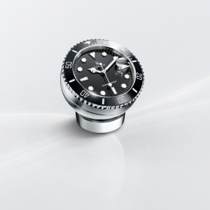 The Submariner desk clock in stainless steel, with a Cerachrom bezel insert and Chromalight display, incorporates a secular calendar.
