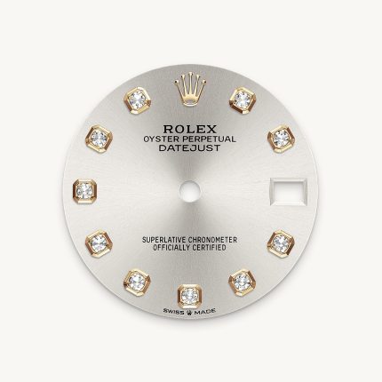 This dial features diamonds in 18 ct gold settings. The sunray finish creates delicate light reflections on many dials in the Oyster Perpetual collection. It is obtained using masterful brushing techniques that create grooves running outwards from the centre of the dial. Light is diffused consistently along each engraving, creating a characteristic subtle glow that moves depending on the position of the wrist. Once the sunray finish has been completed, the dial colour is applied using Physical Vapour Deposition or electroplating. A light coat of varnish gives the dial its final look.