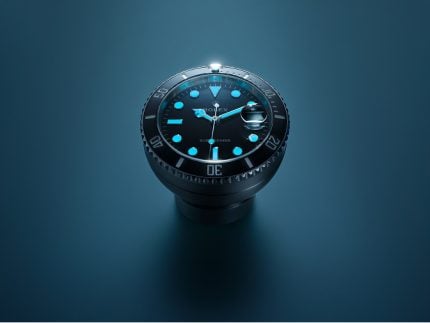 This Rolex desk clock with a secular calendar faithfully revisits the design of the Submariner Date. It displays the time and date with a 60-minute graduated monobloc Cerachrom bezel insert as well as a Chromalight display that emits an intense blue glow in the dark.